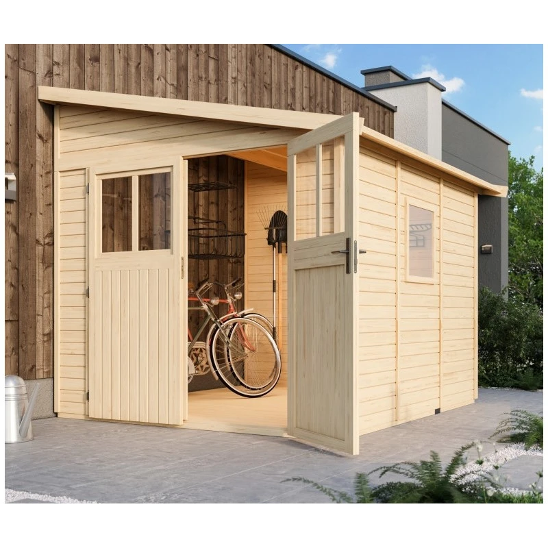 Construit en épicéa du nord, brut, il se targue d’un design naturel et simple. L’abri Bomlitz 3 est équipé de 2 portes battantes avec une serrure à gorge et vitres en plexiglas, ainsi qu’une fenêtre sur la paroi qui rend son intérieur lumineux et clair. Il est recommandé d’appliquer une lasure sur les panneaux pour protéger le bois contre l’humidité, les champignons et les insectes. Vous pourrez également le peindre afin d’avoir un abri personnalisé.