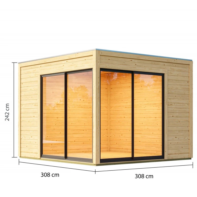 L’abri de jardin Dice 3 avec sa forme cubique de dimensions 308x308cm et son toit plat reste très pratique et élégant. Sa surface de 9,49m² vous offre suffisamment d’espace afin de l’aménager selon vos envies et besoins. Elle peut se transformer en endroit de stockage pour vos outils de bricolage et jardinage ou en pièce supplémentaire à l’extérieur de votre maison, c’est à vous de décider.