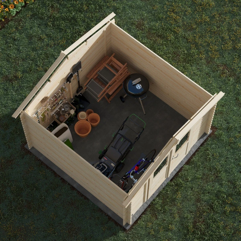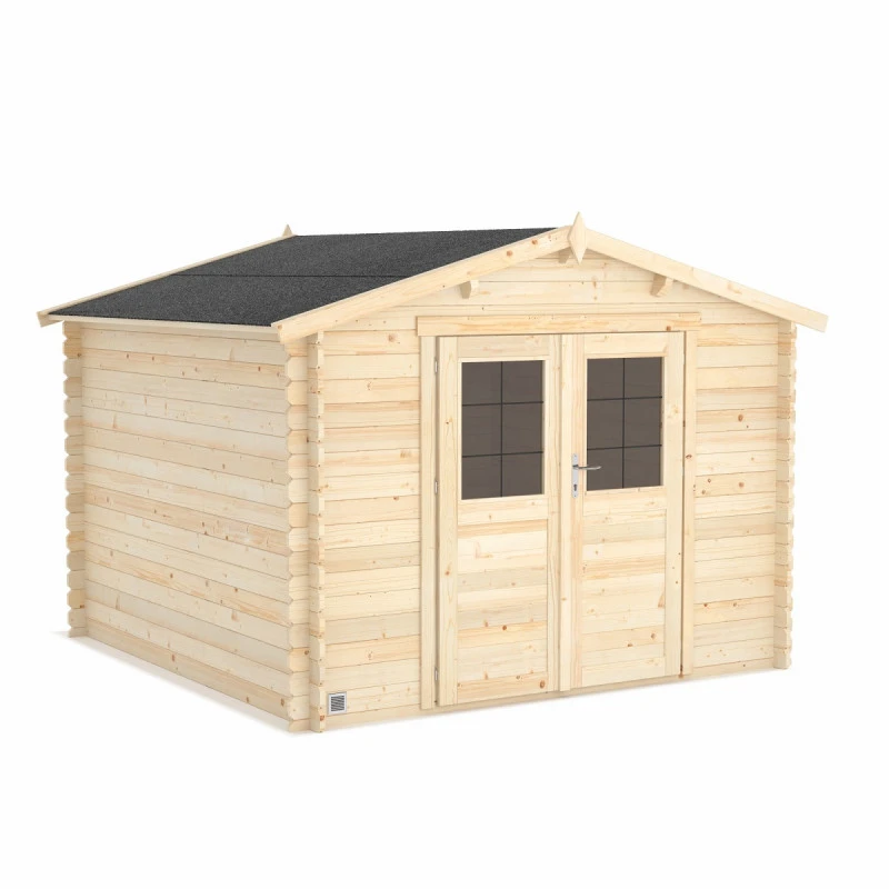 L’abri de jardin en bois massif 8,9m² Volta possède un toit double pente avec le feutre bitumé comme couverture initiale. Les deux grilles de ventilation et la visserie en acier inoxydable sont également incluses comme preuve d’une finition de qualité.