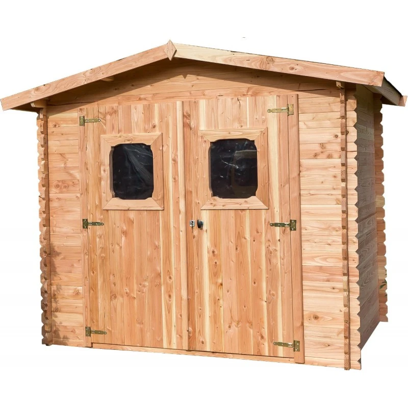La double porte de 160x186cm offre un accès facile, elle est munie de lucarnes fixes à vitrage PVC, d’un verrou à poussoir et les pentures sont bichromatées. Le montage se réalise simplement, grâce aux madriers à rainures et languettes qui s’emboîtent l’un sur l’autre, et aux débords des parois dans les angles qui assurent une stabilité structurelle optimale.