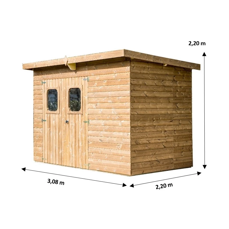 L’abri Theora monopente possède une toiture de plaques en acier galvanisé pour une protection durable contre les éléments. Ses dimensions extérieures de 3,08×2,20m développent une surface hors-tout de 6,78m² pour une surface intérieure de 4,70m². Sa hauteur maximale en façade avant est de 2,20m.