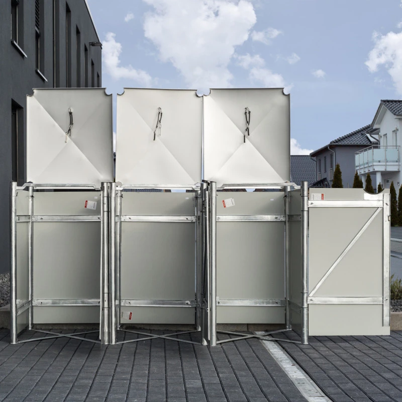 Ce modèle est prévu pour une utilisation en extérieur, il ne craint pas les intempéries et ne demande aucun entretien spécifique. Chaque compartiment est muni d’un portillon ouvrable sur la face avant et d’un couvercle avec crochet et cordelette pour une ouverture automatique de votre conteneur à déchets.