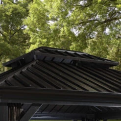 Pour vous assurer une bonne protection contre la pluie et le vent, ce solide gazebo de 12,57m² Sojag est pourvue de deux rails et d’une moustiquaire en nylon. Les parois de côté adaptées sont également disponibles en option pour fermer complètement la pergola.