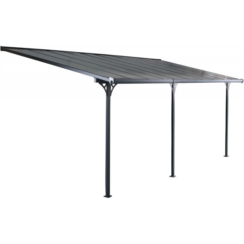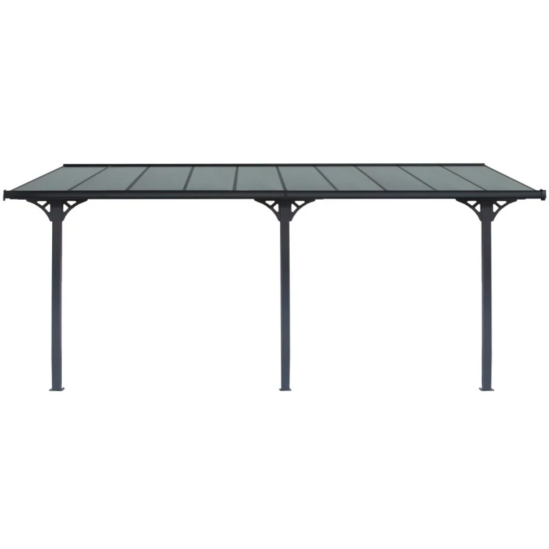 Réalisée en aluminium, anti-corrosio, recouvert d’une peinture qualitative multi-couches de couleur anthracite, pour un aspect moderne, cette pergola adossée est couverte de panneaux épais de 6mm en polycarbonate fumés gris pour un accord parfait et pour filtrer plus efficacement les rayons du soleil.
