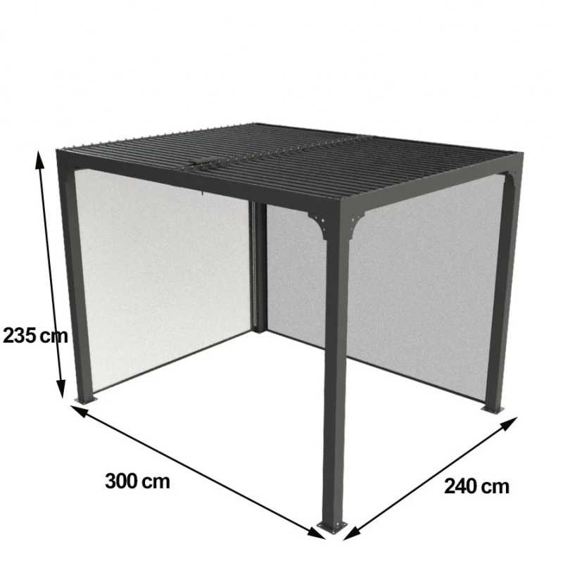 Produit de haute qualité, la pergola bioclimatique 7,20m² Habrita est réalisée en aluminium qui est un matériau léger, robuste et durable. Il résiste bien aux intempéries et à la corrosion et ne demande aucun entretien spécifique. Les lames ovales de toit, également en aluminium, sont orientables ce qui vous permettra de réguler vous-mêmes la lumière pénétrante sous le toit de pergola. Pour votre plus grand confort, les deux rideaux en PVC tissé 430gr/m² sont réglables en hauteur à l’aide d’un mécanisme manuel. Le système de guidage fixé aux poteaux opposés vous garantit une meilleure stabilité au cas du vent.